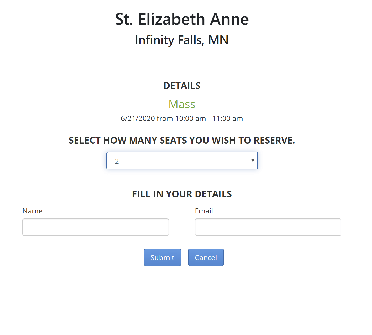 User selects how many seats they wish to reserve, they enter in their name and their email address. Users are limited to a maximum of 5 seats per reservation.